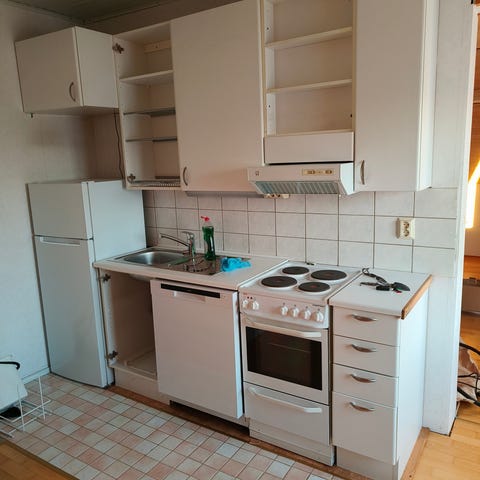 Nopea nouto ja itse pitää purkaa kaapit seinästä. Tumman vihreät ovet. Hella ja tiskipöytä kuuluu kalusteisiin. Hanan ja jääkaapin pidän itselläni.