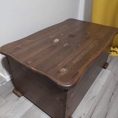 Arkku on vihreä ja siinä on kukkakoristeluja. Maalit ovat rapistuneet, mutta arkku on ehjä ja sisältä siisti. Kupera kansi. Arkussa on metallivahvistuksia. Koko: korkeus 47 cm, levys 45 cm ja pituus 63 cm. Ostaja vastaa toimituskuluista, ellei nouto.