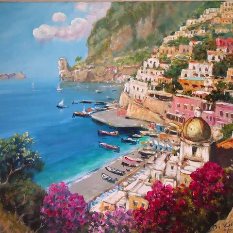 Kaunis ja vaikuttava öljymaalaus kankaalle, kooltaan 40 x 50 cm, mestari Partenopeo Giuseppe Luongo (1948). Rinnastaa vaikuttavan kulman Caprin kalastajaveneineen ja taustalla Faraglioni-kalliot. Kauniit värit; näkyy erinomainen maalaustaito. Alhaalla allekirjoitettu ja takana taiteilijan allekirjoitus sekä taiteilijan todistus. Peräisin yksityiskokoelmasta ja toimitus on seurattavissa.