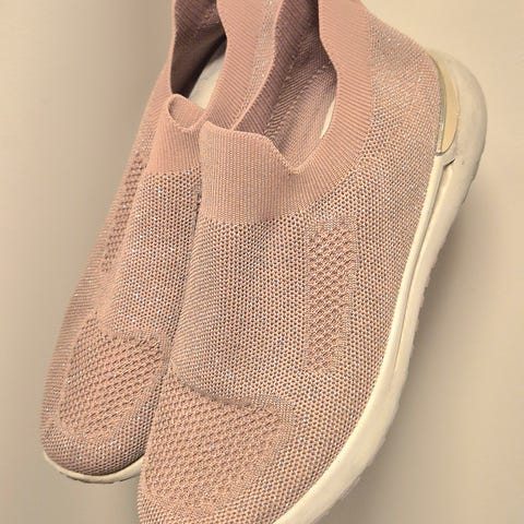 Täältä ostetut purppuranväriset, hengittävät slip-on-lenkkarit. Epäilen näiden olevan temusta. Kevyet kengät.