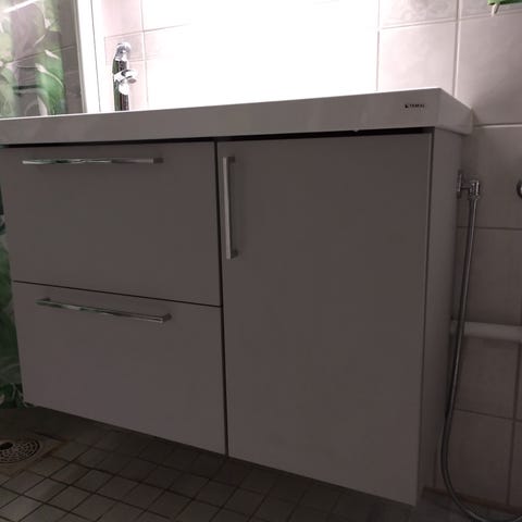 Myydään Temalin kylpyhuoneenkaappikokonaisuus, joka koostuu kaapista ja integroidusta kylpyhuoneenvalaisimesta, jossa on pistorasia.