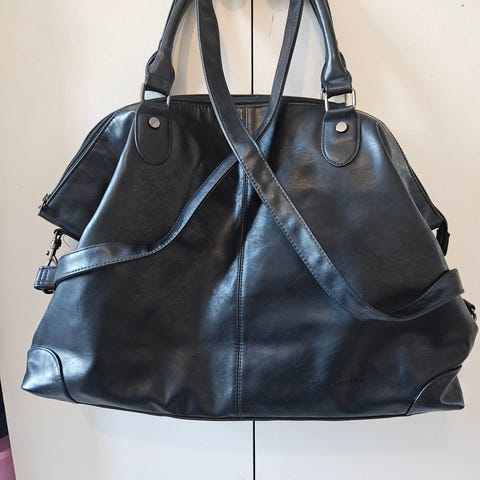 Iso keinonahkainen viikonloppulaukku. Henkarit kuvassa laukun sisällä vain osoittaakseen laukun kokoa.