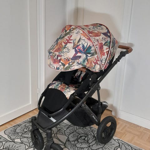 AI: "Britax lastenrattaat harmaalla värillä. Rattaissa on säädettävä istuinosa, turvavyöt ja kuomu. Rungossa on neljä pyörää, jotka tarjoavat vakautta ja helppoa liikkuvuutta."