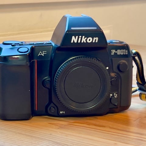 Elämää nähnyt Nikonin filmijärkkä elvytettäväksi tai elinluovutukseen. Menee virtoihin, peili räpsähtää ylös räväkästi laukaistessa, mutta suljin pysyy kiinni. Tästä ilmeisesti myös näytön "ERR" viesti haluaa kertoa. Filmin kelaus, valitsimet yms vaikuttavat toimivan ongelmitta. Takaluukun salpa on todella tiukka, ja vivusta murtunut pala (toimii kuitenkin ja luukku aukeaa).