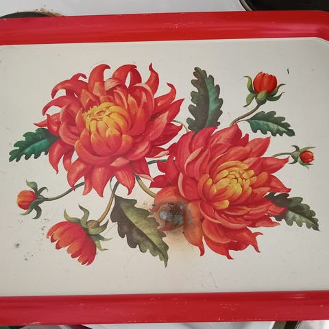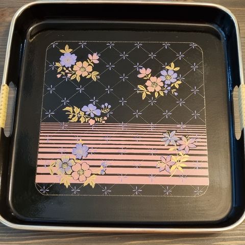 Myydään kukkasomisteinen, upea tarjotin. Tarjottimen pinta on lakattu. Tarjottimen leveys on 30 cm ja pituus on 47 cm. Tarjotin on käyttämätön eli se kaikinpuolin täysin hyväkuntoinen, siisti ja ehjä. Tarjottimen takapuolen pinnassa on pieniä, kauniisti kimaltelevia glitter-hileitä. Tarjotin on peräisin kasarilta. Made in Japan.