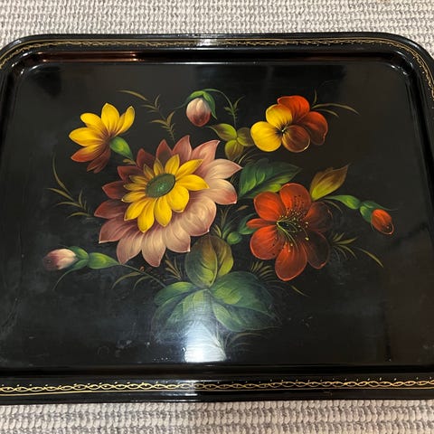 70-luku CCCP vintage upea musta peltitarjotin suuri 45cm peltinen kukka tarjotin