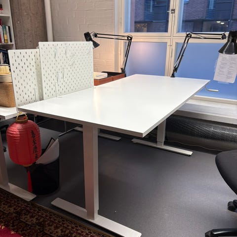 Ikea Trotten työpöytä, korkeuden säätö kampea veivaamalla. Käytetty, mutta toimiva. Pinnassa pientä kulumaa, katso kuvat.