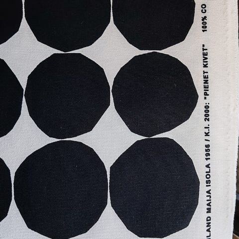 Marimekon markiisikangasta 4,5 metriä. Kuvio on Kirsikka, suunnittelija Iiro. A. Ahokas vuonna 2007. Ostettu aikoinaan Marimekon liikkeestä, on a-laatua. Minulta jäi ompeluhuoneen kaappiin odottamaan inspiraatio. Sitä ei ole tullut, joten seuraavalle todelliselle toteuttajalle.