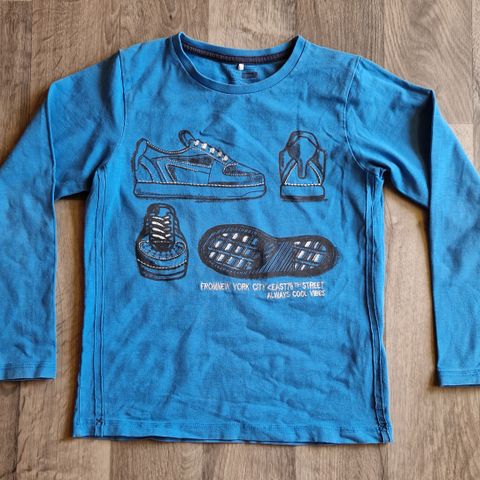 Name it Sininen puuvillapaita pojille, koko 122. Pitkähihainen paita, jossa painatus etupuolella. Valmistettu puuvillasta.
