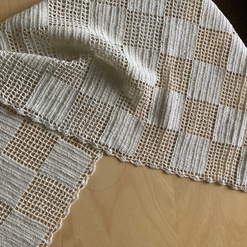 Myyn kuvanmukaisen kalalangasta virkatun pöytäliinan koko noin 42 x 54 cm. On hyväkuntoinen joskin ryppyinen kun on ollut tuolla muuttolaatikossa.