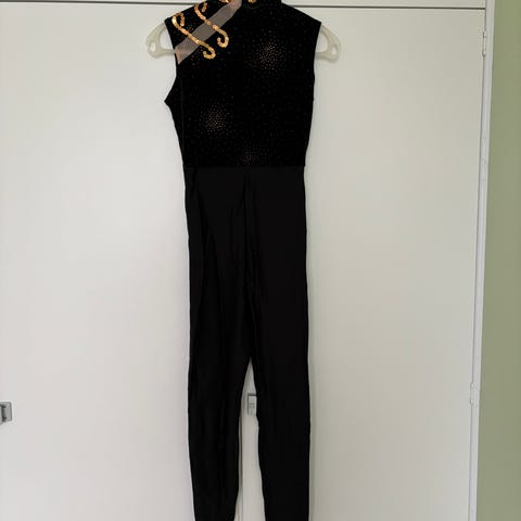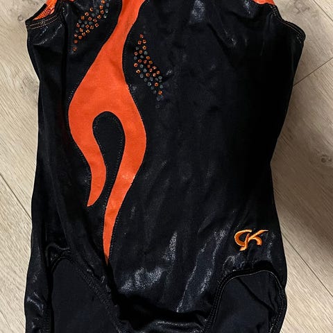 Yhdellä 13-vuotiaalla käytössä ollut voimistelupuku, muuten moitteeton kunto, mutta sauma nauraa muutamasta kohdasta (helppo korjata). Mustaa lycraa, yläosassa värikkäät yksityiskohdat.