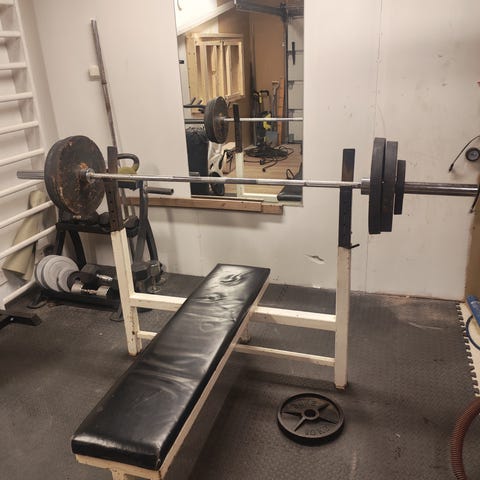 4 x 1,25kg, 4 x 2,5kg, 6 x 3kg, 2 x 5kg, 2 x 10kg ja 2 x 15kg.