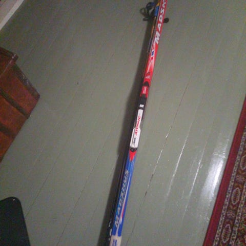 Madhus 180cm sukset, joissa on musta ja valkoinen väri punaisilla yksityiskohdilla.