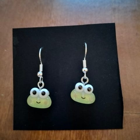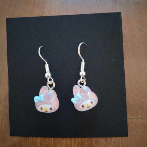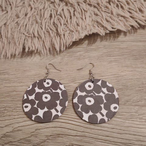 Roikkuvat kevyet kukka Unikko korvikset. Oletettavasti jonkun itsetekemät. Väri vaaleanpunainen mustalla keskustalla ja mustalla taustan värillä. Uudet, käyttämättömäksi jääneet.