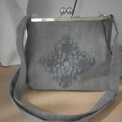 Myydään vahvasta sisustuskankaasta kuin farkkua tehty pussukkalaukku jossa erillinen vuori ja välissä silitetty vanu, säädettävä samasta kankaasta tehty vahva hihna, maksimipituus 130 cm. Sangan leveys 21 cm. Laukun korkeus 21 cm.