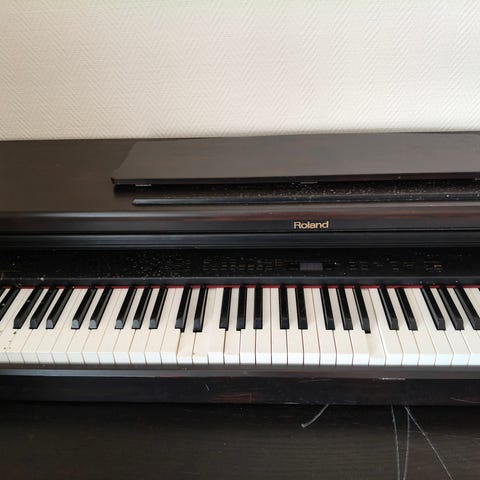 Puinen piano, jossa on kansi. Sopii sisätiloihin musiikin soittamiseen ja harjoitteluun. Pinnassa muutama jälki.
