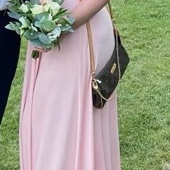 Kaunis olkaimeton juhlapuku, jossa on runsas tyllihelma ja herkkää vaaleanpunaista kukkakirjailua hienovaraisella kimalluksella. Prinsessamallinen leikkaus ja korsettiyläosa.