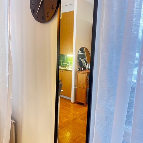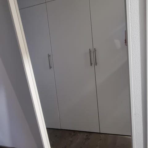 Rikkinäinen IKEA Nissedal peili 65x150. Peili ollut ripustettuna kakspuolisella teipillä ja tippunut lattialle. Toinen päätypala irti. Peilin taustalla vielä kakspuolista teippiä.