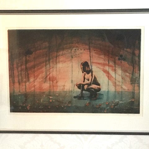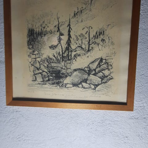 Guassi-väreillä toteutettu grafiikkateos. Koko 58 x 46 cm.