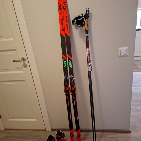 Lisäksi pakettiin kuuluu sukset ja sauvat yhdesspitävät kiinnikkeet x2, suksipussi ja luistovoide.