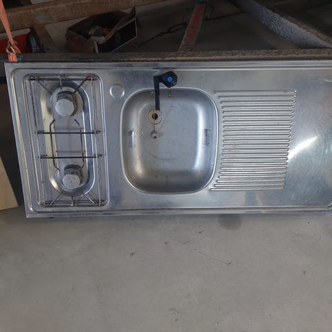 Teräksinen tiskiallas ja kaasuliesi yhdistelmä, jossa on tiskiallas, kuivaustaso ja kaksi kaasupoltinta. Käytetty keittiökaluste, joka soveltuu pieneen keittiötilaan tai retkeilykäyttöön.