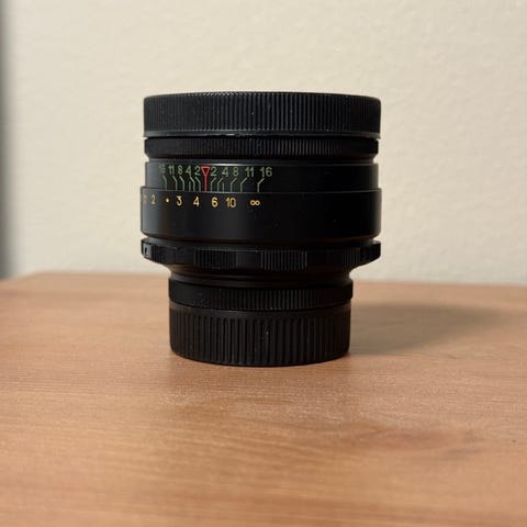 Helios-44M objektiivi. Objektiivissa on manuaalinen tarkennus.