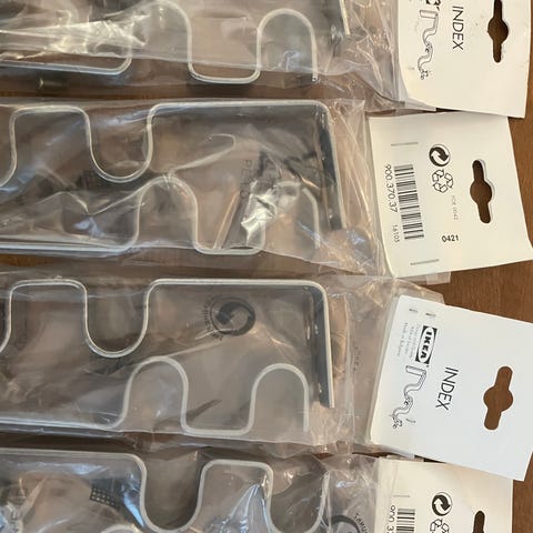 Käyttämättömät metalliset seinään kiinnitettävät verhokoukut, n. 15 cm.