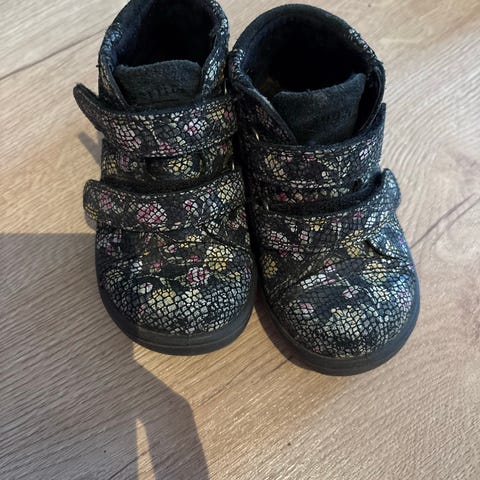 Välikausikengät pitävillä tarroilla, hyvässä käytetyssä kunnossa. Ainoa moite on toisen kengän edessä sauma hieman purkaantunut, kts. viimeinen kuva.