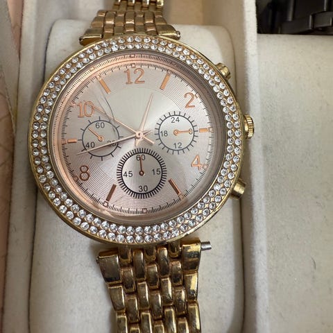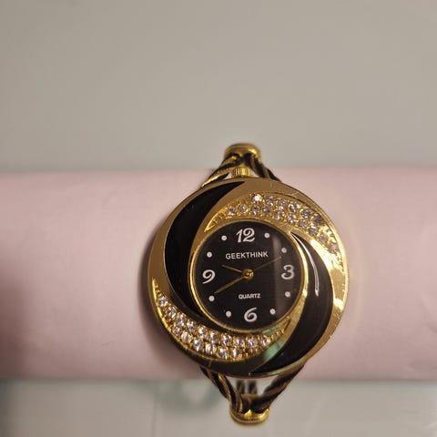 Kultaisen värinen ja neliskanttisen muotoinen naisten rannekello. Käyttämätön ja kuin uusi. Paristot toimii. Mukaan saa viimeisessä kuvassa näkyvän rannekkeen lyhennys työkalun.