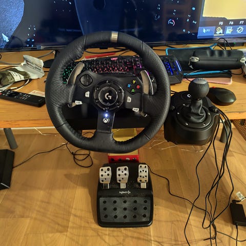 Logitech G29 ohjauspyörä ja polkimet pelikäyttöön. Ohjauspyörä on musta ja siinä on useita säätöpainikkeita. Poljinlaite sisältää kolme metallipoljinta mustalla alustalla. Laite on tarkoitettu simulaattoripelien ohjaukseen. Käytetty alle 5 kertaa, myynnissä ajan ja rigin puutteen vuoksi. Käy ps4/5 ja pc