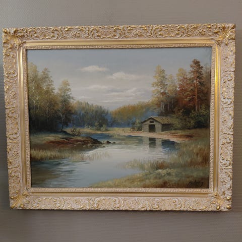 Öljyvärimaalaus, jossa esitetään järvimaisema rantamökkeineen, puineen ja vedenpinnan heijastuksineen. Teos on vaakasuuntainen ja kiinnitetty puiseen kehykseen, jossa on kultainen lista. Taustalla näkyy metsää ja taivas pilvineen, etualalla rantaviivaa, kaislikkoa ja vesirajassa oleva rakennus. Maalauksen takana näkyy kangaspohja ja puinen kiilakehys. Sopii seinälle esimerkiksi olohuoneeseen, makuuhuoneeseen tai mökille sisustuselementiksi. Merkit ja signeeraus näkyvät maalauksen etuosassa, mutta taiteilijan nimeä ei ole luettavissa kuvista. Singeeraus näkyy kuvista. Kehyksen koko 108.5x78cm iso maalaus