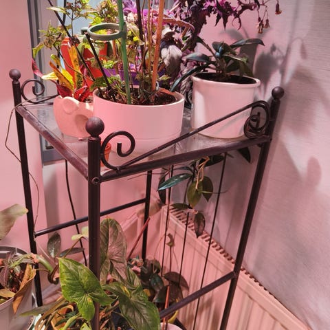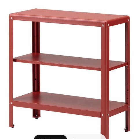 Meillä kylppärissä ja veskissä toiminut hyllynä. Musta, metallinen ja koristeellinen. Hyllyt joko lasia tai metallia. Voi kiinnittää seinään ja jalat ovat säädettävissä.