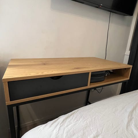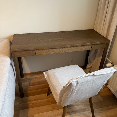 Kaunis simppeli työpöytä. Edessä yksi laatikko. Kunto erinomainen. Kompakti koko. Sopii työpöydäksi tai esim. meikkipöydäksi :) Uutena 149€
