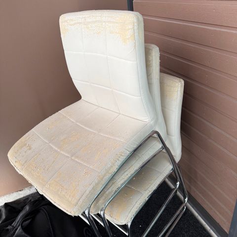 Ruokapöydän tuolit 6kpl. Verhoilu keinonahkaa. Tuolien rungot kunnossa, mutta verhoilut alkaneet kuoriutumaan.