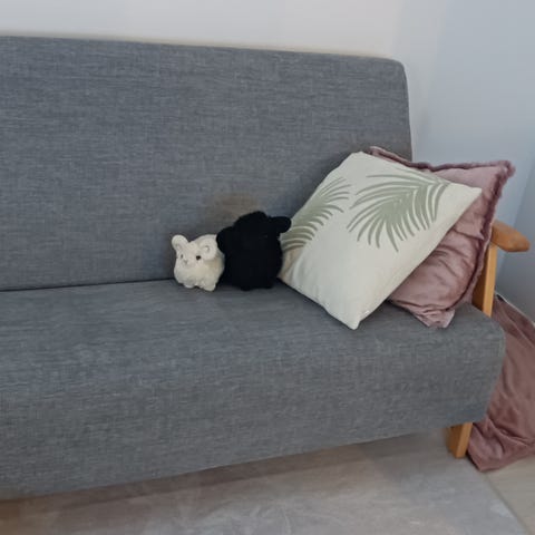 Kuvan sohva, pituus 210 cm, selkänojan korkeus 84 cm, istuinosa päällystetty jokin aika sitten Lauritzonin laadukkaalla kankaalla. Selkänoja nousee, jolloin saa reilun vuoteen yhdelle hengelle. Nouto.