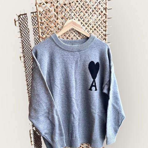 Ami Paris miesten neule harmaa. Koko M. Neuleessa on pyöreä pääntie ja musta sydänkuvio vasemmalla rinnalla. Kysy lisää📸