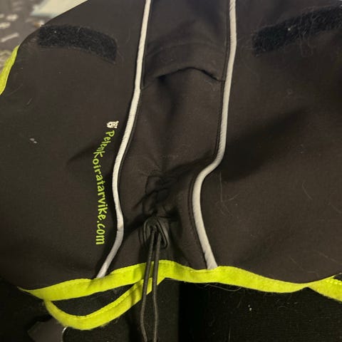 koiran takki musta keltainen värein. Takissa on heijastinnauhat ja säädettävät remmit. koko 25