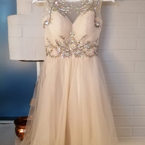 Kaunis, kermanvärinen rippimekko tai juhlamekko merkiltä Laona. Olkaimeton, sydämenmallinen yläosa. Koko 34.