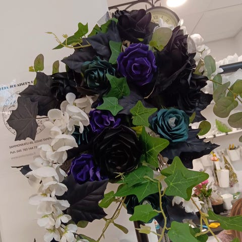 Rockmorsiamen rosamelia tyylinen koriste. Luurankokäsien väliin satiininauhasta käsin valmistettu hääkoriste. Peikonpaju Oy. Finland. Postitus tai Nouto myymälästä.