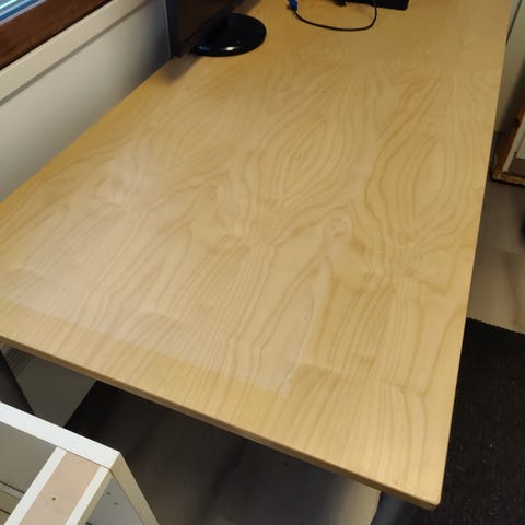 Kaksi näkyvämpää naarmua pöydän kannessa vasemmalla. Näkyy kuvassa.