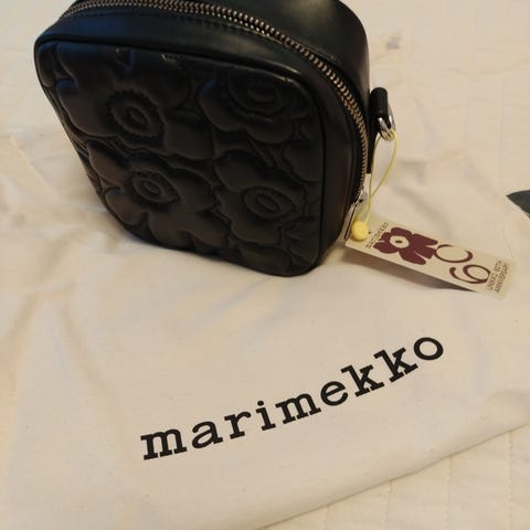 Marimekko Unikko -kuosinen musta Gratha ja hihna. Laukku jäänyt vähälle käytölle, joten on uudenveroisessa kunnossa.