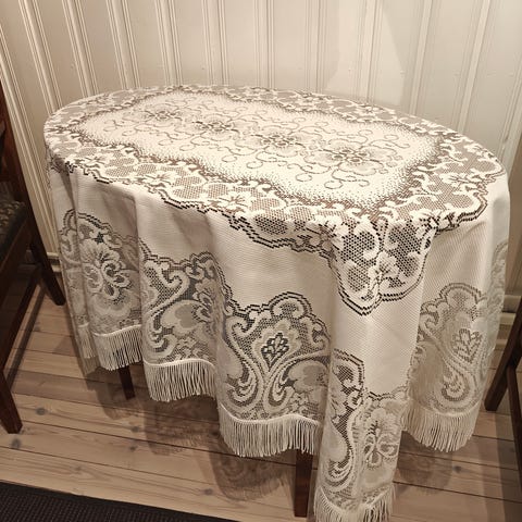 Upea valkoinen pöytäliina, jossa on puuvillakangasta ja pitsikuvioita. Pitsit ovat reikäisiä ja pöydän pinta tuo ne näkyvimmiksi. Liina on kerran pesty eikä sitä ole silitetty sen jälkeen. Liina on kuitenkin moitteettomassa kunnossa.