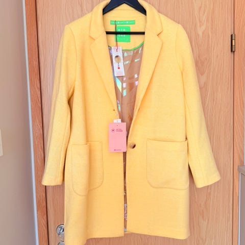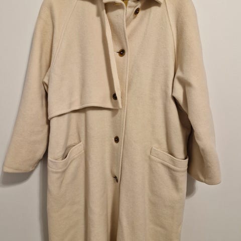 Uuden veroinen punainen villakangastakki. Päällinen 75% villaa, 25% polyamidia ja vuori 100% polyesteria.