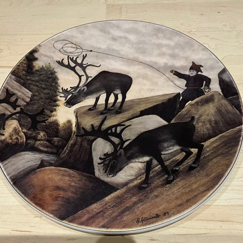 Lautasen aiheena on pontikankeitto Lapin maisemissa.