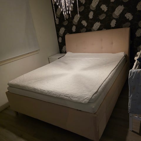 IKEA Idanäs-mallin valkoinen puusänky. Esim ks https://www.ikea.com/fi/fi/p/idanaes-saengynrunko-jossa-laatikot-valkoinen-30458870/