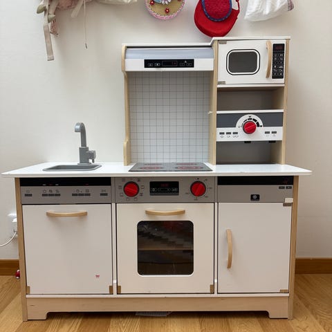 Myydään hyvin tykätty leikkikeittiö ja samassa siihen kuuluvat, kuvassa näkyvät tarvikkeet. Samassa siis kaikki kivaan keittiöleikkiin tarvittavat tarvikkeet! Mieluisia on etenkin ollut tarrakiinnityksellä olevat vihannekset ja hedelmät, joita voi leikkiveitsellä pilkkoa.