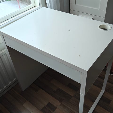 Ikean Micke-työpöytään lisäosa. Käytönjälkeä oli jo kun meille tuli, ja meidän käytössä ne on lisääntynyt. Olen pyyhkinyt pölyt mutta muuten en ole koettanut tahroja poistella. 2kpl hyllylevyjä tulee mukaan.