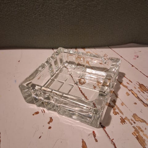 Lasinen tuhkakuppi 11 cmx11cm, jossa on mainoskuvitus Lappeenrannan Autokeskus Oy:stä ja Ford-logosta. Muotolasi Oy:n valmistama.