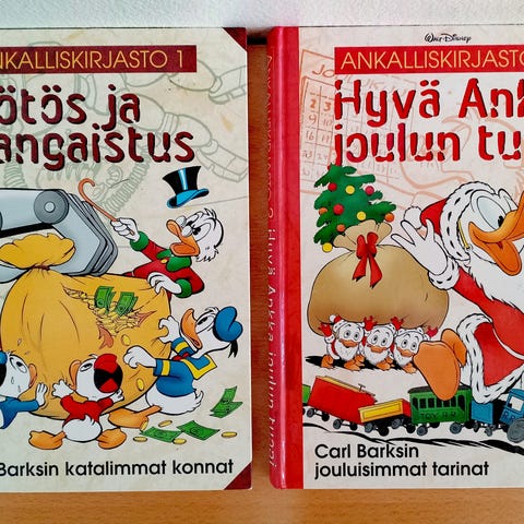Ankalliskirjaston 1 ja 2 -kirjat, jotka sisältävär Carl Barksin tarinoita.