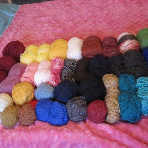 Tässä on käytännössä seitsemän kokonaista kerää. Langat on säilytetty aina kuivassa paikassa eli vaatehuoneessa muovilaatikossa. Ei siis pahaa hajua. Mielellään kaikki kerralla.
